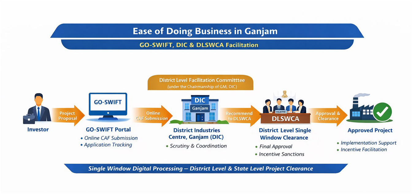 Together, GO-SWIFT provides the digital platform for single-window approvals and tracking, while DIC and DLFC ensure on-ground facilitation and decentralized decision-making, accelerating clearances, reducing compliance burden, and enhancing the business climate for investments across Ganjam.