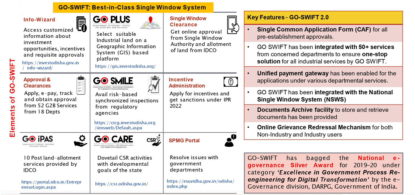 GO-SWIFT (Government of Odisha – Single Window for Investor Facilitation & Tracking) is Odisha’s integrated digital single window system designed to streamline industrial approvals, compliances, incentives and project lifecycle services through one online platform. It enables investors to submit a single Combined Application Form (CAF), make online payments, track status, receive digitally signed clearances and access related G2B services — with minimum human interface and time-bound delivery mapped to statutory timelines. The portal also provides information on required clearances, available land banks, synchronized inspections, incentive applications and post-allotment services.