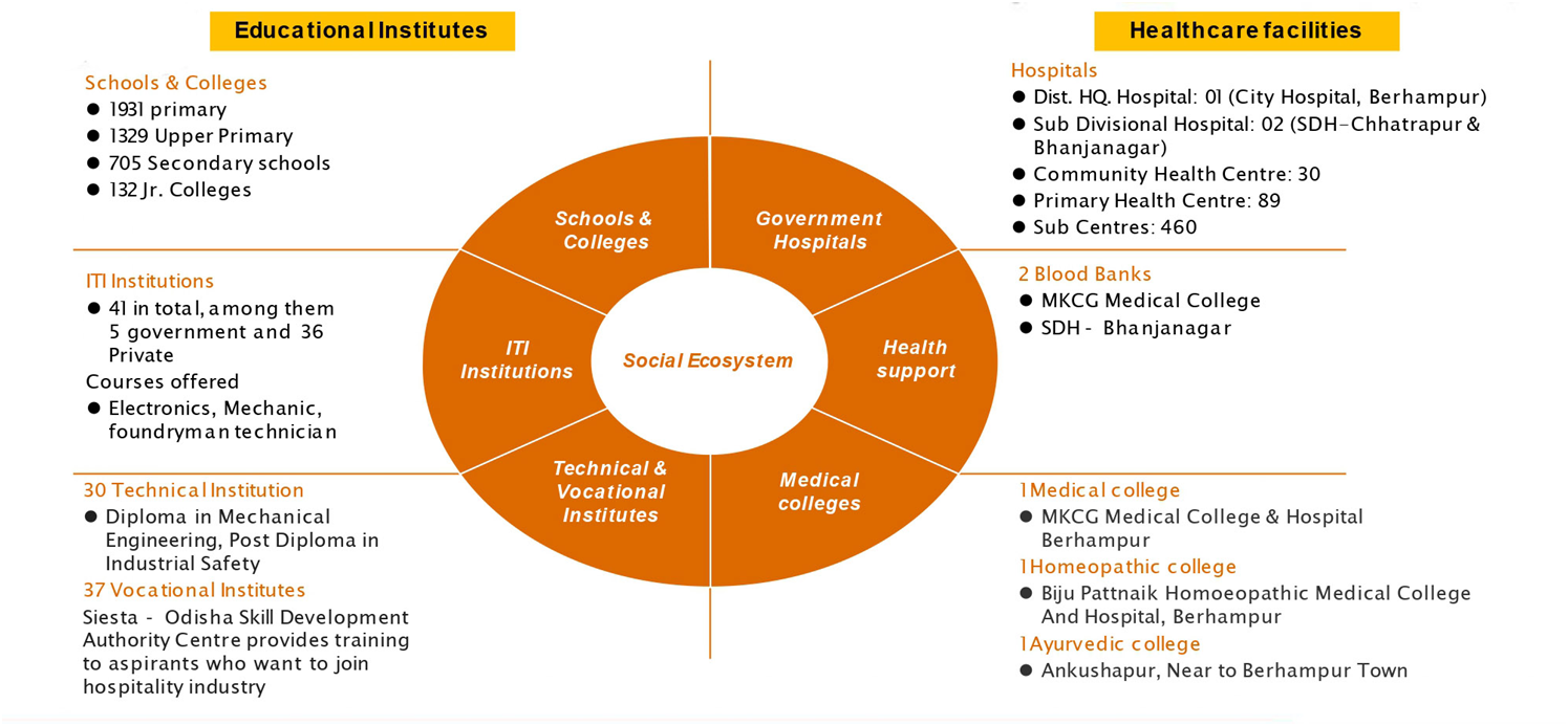Large scale industries viz. Indian Rare Earth at Matikhala, Chatrapur, M/s Aska Co-operative Sugar Industries Pvt. Ltd. at Aska & M/s Grasim Industries at Jayashree, Ganjam, Saraf Agencies Pvt. Ltd. at NH-16 By Pass, Chatrapur, The Ferro Chrome Plant of Tata Steel SEZ Ltd, at NH-16 By pass, Chatrapur are the mother units facilitating for establishment of Ancillary & Downstream enterprises. Apart from this, there are four Medium Scale Enterprises namely M/s Sudhakar PVC products Pvt. Ltd., TATA Consumer Products Ltd, Chilika Distilleries Private Limited and M/s United Spirits Ltd..