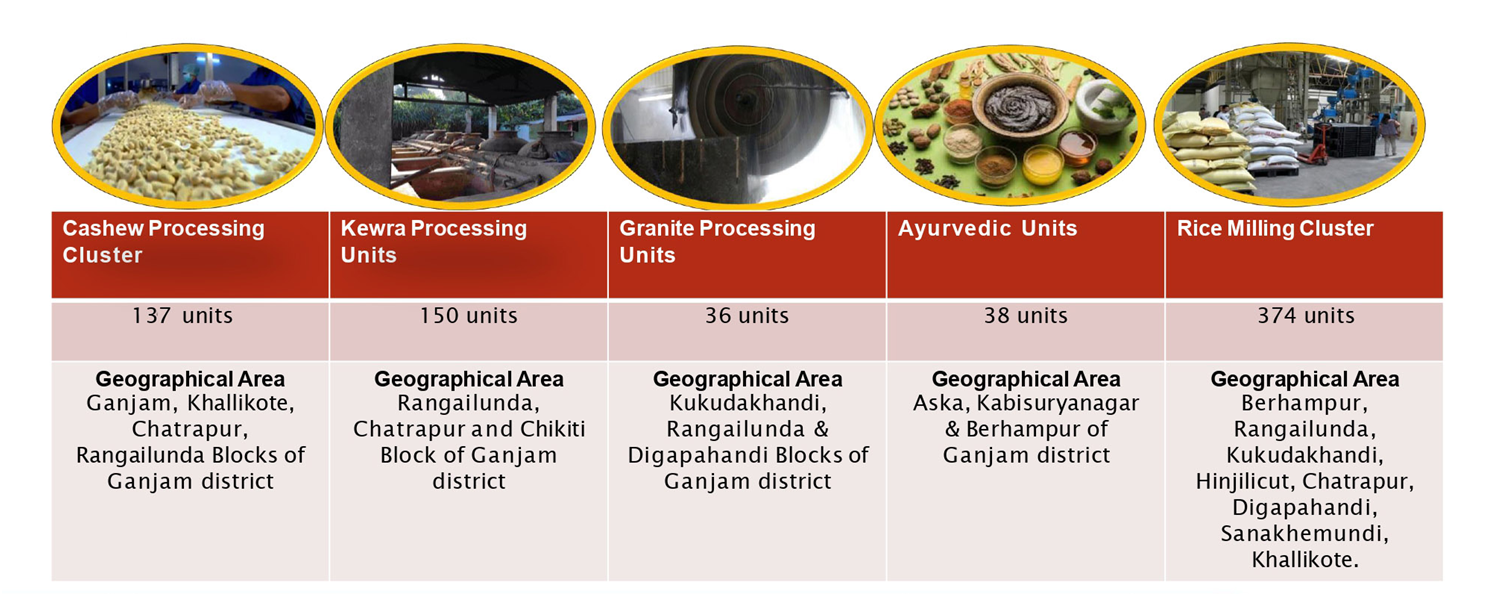 Five numbers of MSECDP clusters viz M/s Sri Jagannath Cashew Cluster Pvt. Ltd at Rambha, Granite Cluster at Berhampur, Ganjam Kewda Development Cluster at Berhampur, Rushikulya Ayurvedic Cluster at Mohulapalli of Kukudakhandi Block & Rice Mill Cluster at Berhampur which are considered as effective platforms to enlarge production base, trigger growth, alleviate poverty & redress regional and economic imbalance have been facilitated to face the challenges boldly & effectively in the district.